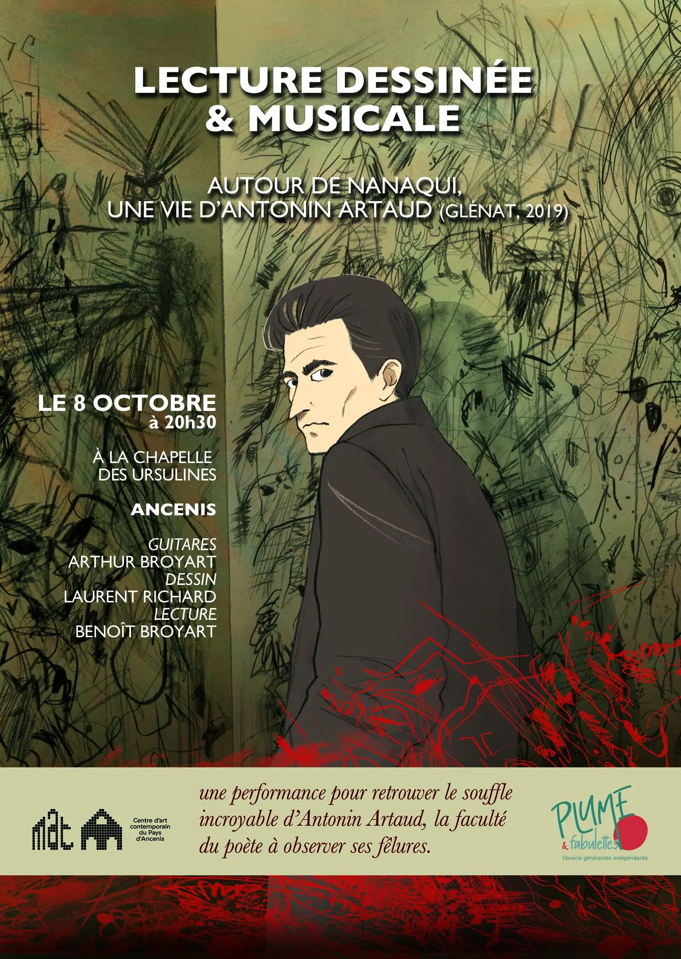 En prenant comme point d’appui leur roman graphique Nanaqui, une vie d’Antonin Artaud, Laurent Richard et Benoît Broyart proposent un parcours de découverte dans l’œuvre touffue et sombre du poète. La guitare d’Arthur Broyart se mêle à la voix du lecteur pour révéler les images dessinées par Laurent Richard.